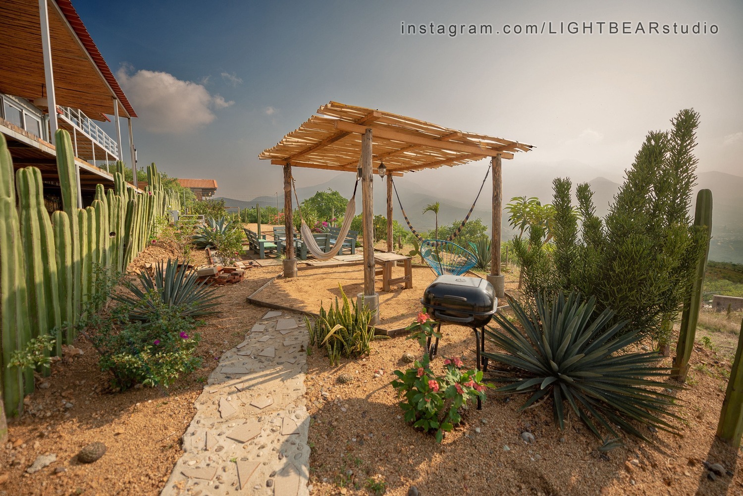 • Palapas con hamacas para relajarse y cocina al aire libre con asador para comer junto a la piscina.
